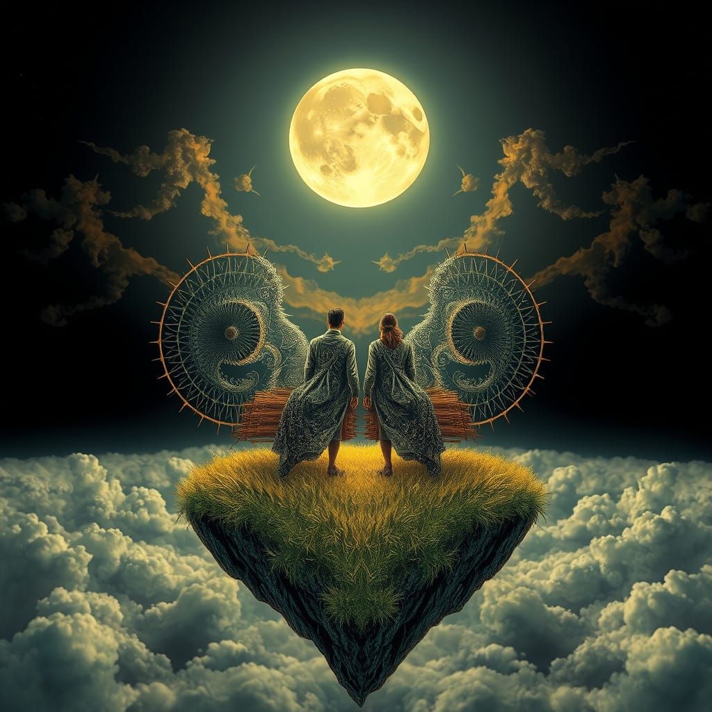 This image shows a couple enjoying a hayride on a floating island under a harvest moon. The scene, rendered as 8K digital art, incorporates mirrored fractal patterns, sacred geometry and psychedelic elements, creating a dreamlike mindscape.