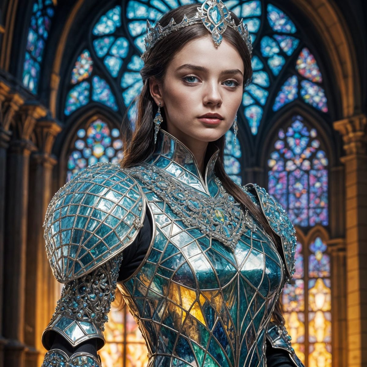 This image features a fantasy queen in a hyperrealistic, concept art style ballgown. The armor-like dress is made of glowing glass panels and sparkling beads, set against a colorful background.