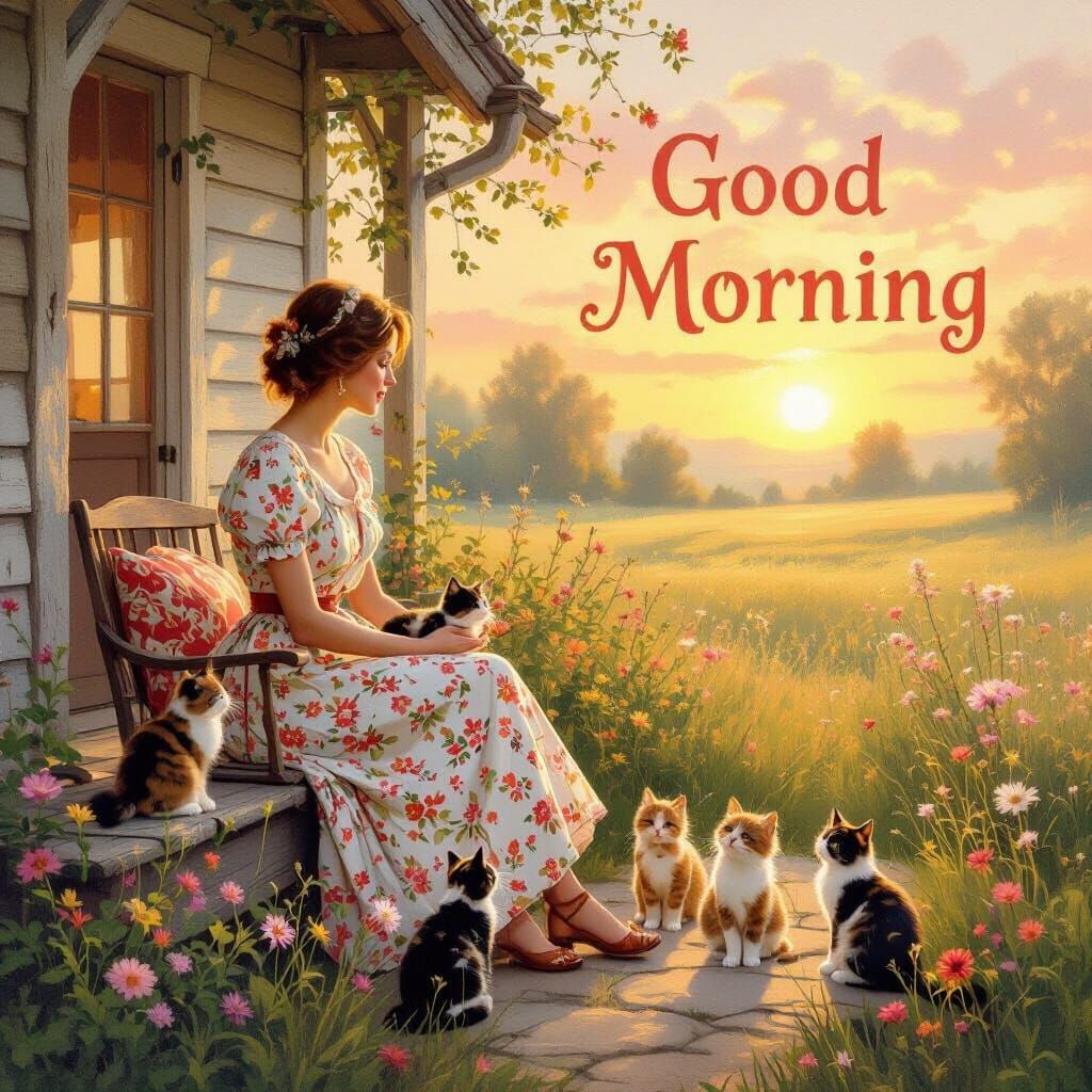 This image shows a woman in a floral dress on a porch with cats, in a serene meadow at sunrise. The artwork evokes a whimsical, rustic impressionist aesthetic.
