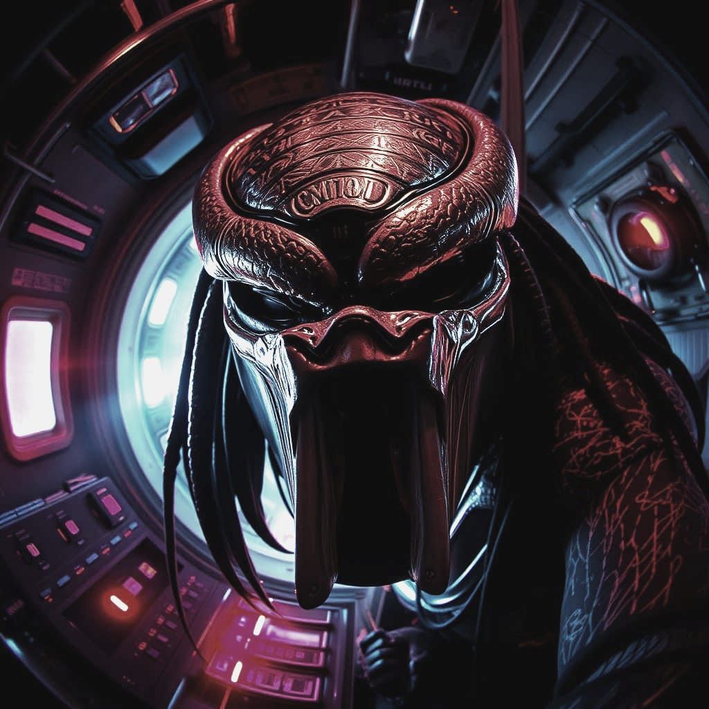 This image is a dark sci-fi horror scene depicting a crossover between Predator and Venom in a deep, ominous space setting, characterized by deep colors and flashing lights, evoking a sense of unease and foreboding.