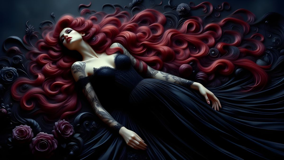 Portrait of a <lora:Romantic Goth:1.0><lora:Enchanted woman:1.0>beautiful romantic woman with long, flowing red hair, lying on the ground. <lora:Art Nouveau Punk V2:1.0>She wears an elegant black dress with soft fabric and dark, glowing highlights in deep shades of midnight blue and violet. Her head ...