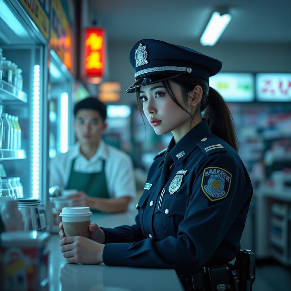 At a convenience store late at night, an exhausted female police officer drinks coffee. That cup of coffee gives her a moment of relief. The respectful gaze of the clerk makes the moment even warmer.