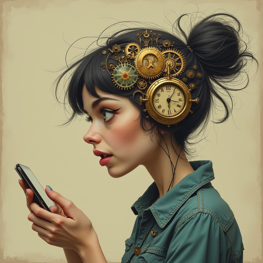This image shows a person with an exposed clockwork brain, surrounded by scenes of repetitive daily actions. The artwork blends steampunk and surrealist elements to create a striking mechanical aesthetic.