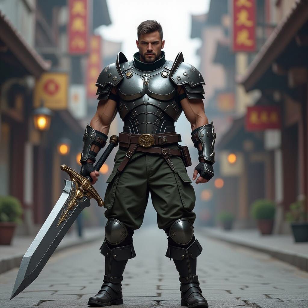 This image shows a warrior in battle stance, wielding a large sword. The character wears a mix of futuristic and medieval armor, complemented by olive-green cargo pants, rendered with realistic textures.