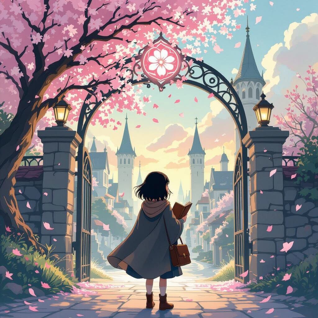 This image shows a girl standing before a magical academy with sakura blossoms. The scene, reminiscent of Ghibli animation, features soft morning light and delicate, dreamy lines, giving the image a warm, ethereal glow.