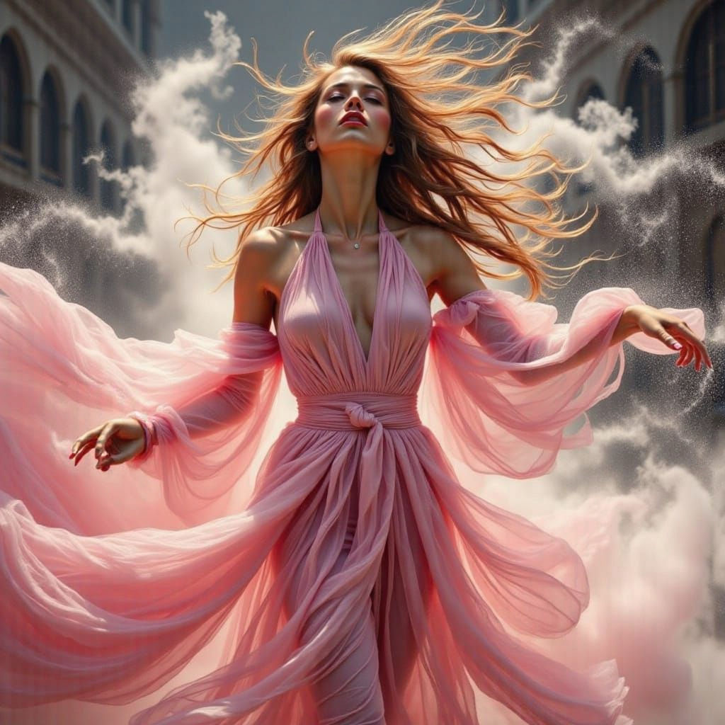 This image features a hyper-realistic, windswept scene with a female subject, showcasing a vibrant color palette and a blend of digital art and pop art styles, with a focus on geometric composition and triadic colors.