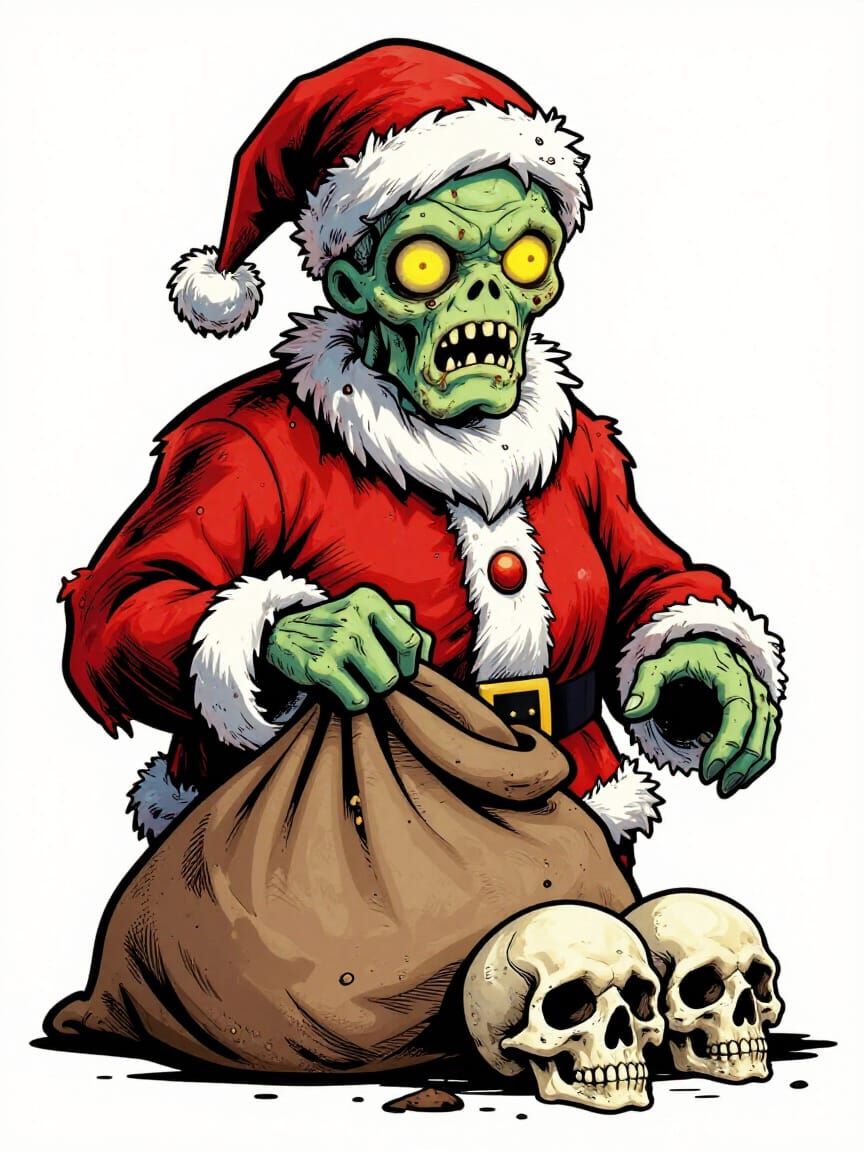 A vintage 80s horror movie poster features a decayed Zombie Santa with glowing eyes and a sack of skulls. Rendered in bold vector art with gritty colors.