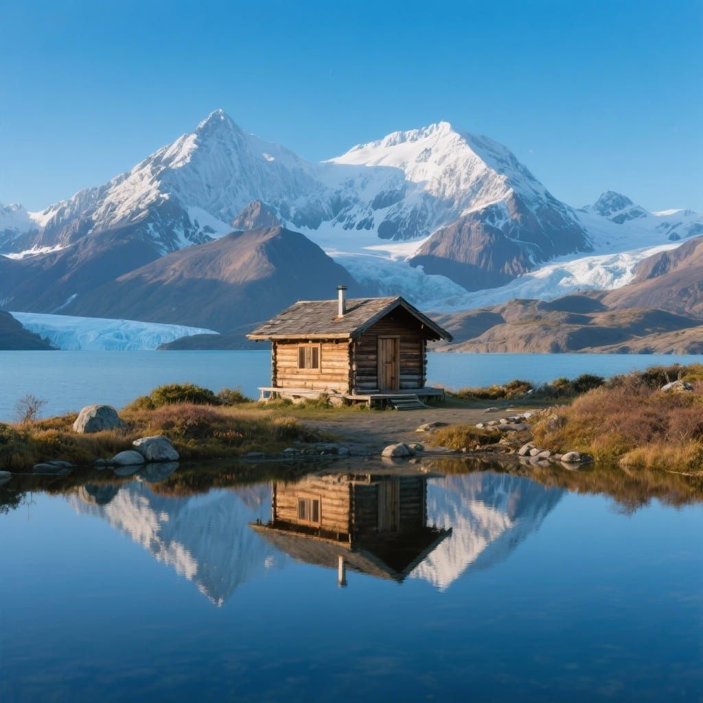 This image shows a simple wooden cabin reflected in a still glacial lake, with snow-capped mountains behind it under a blue sky. Photorealistic style with natural morning light.