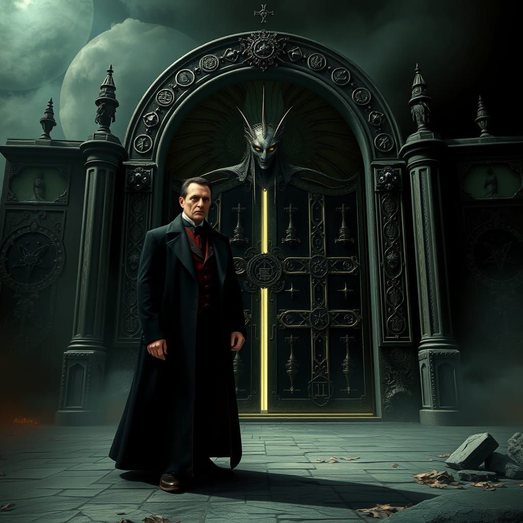 This image depicts a mystical encounter between a Victorian-era occultist and a powerful, otherworldly being, set against a backdrop of eerie, surreal, and mystical elements, evoking the dark, dreamlike atmosphere of a haunting, ethereal realm.
