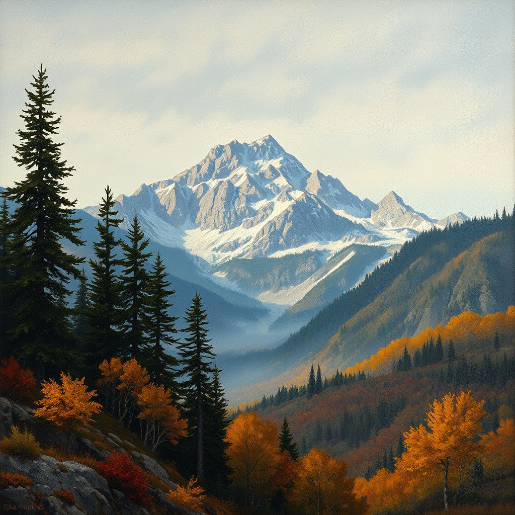 A scenic view of autumnal mountains and evergreen forests. The colors and textures evoke a feeling of loneliness. It is reminiscent of 19th-century art with thick brushstrokes.