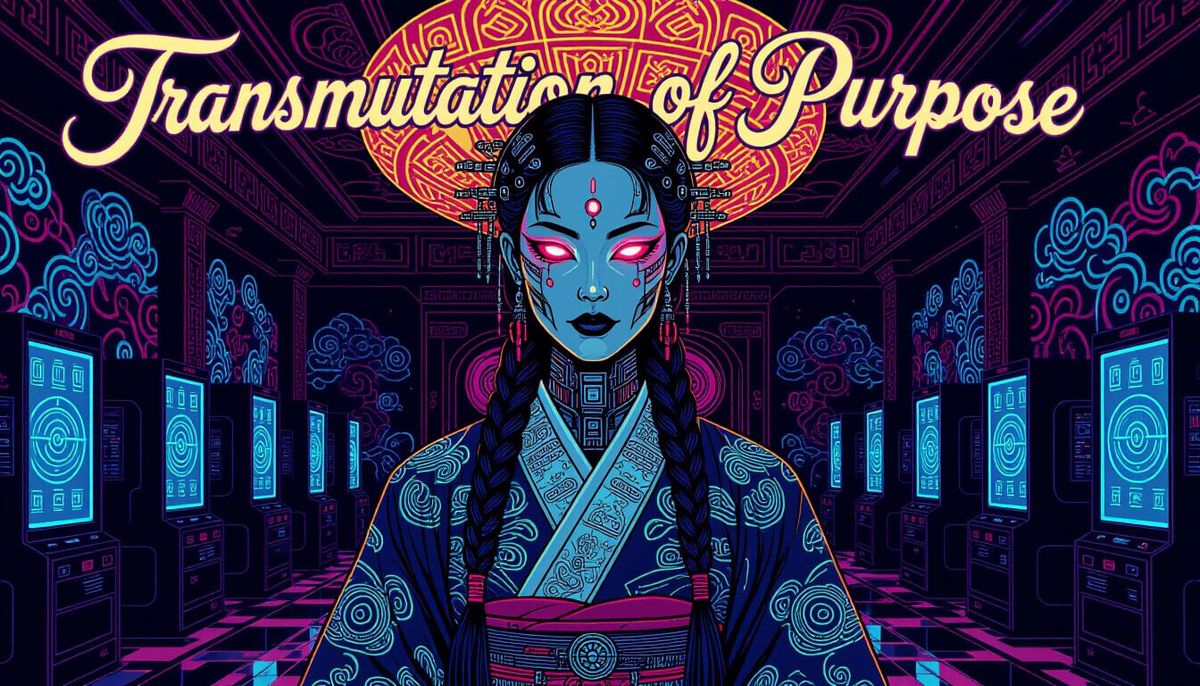 This image shows a female cyborg in ornate shamanic clothing with glowing red eyes. The figure is standing under the text "Transmutation of Purpose" inside an art deco ballroom with neon lights and psychedelic clouds, in a dark, mystical atmosphere.