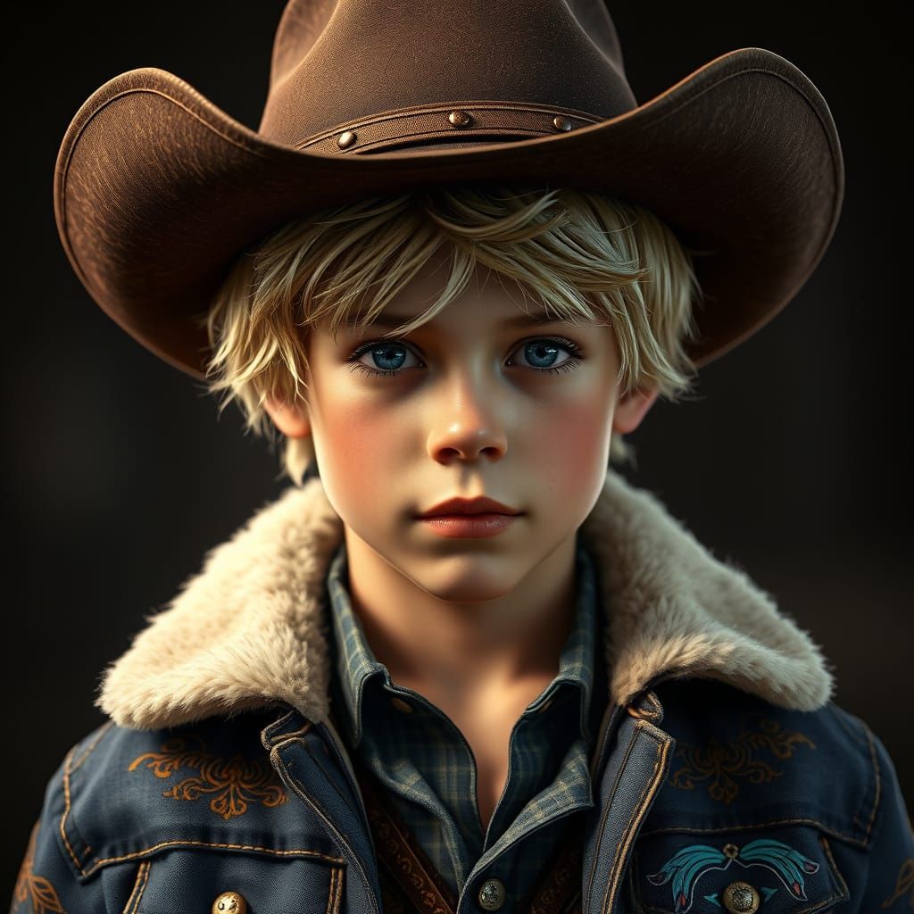 A close-up portrait of a blond boy wearing a cowboy hat and denim jacket. Dynamic lighting and hyperdetailed textures enhance the image, reminiscent of digital art with ornate, intricate designs.