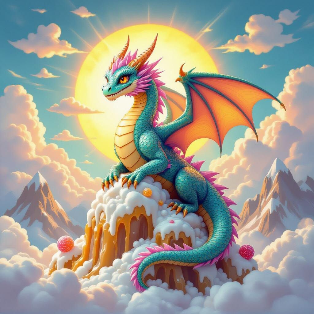 A majestic fantasy dragon with shimmering candy scales and gem-like eyes rests on mountains of nougat and caramel, under cotton candy clouds, in a vibrant, detailed style.