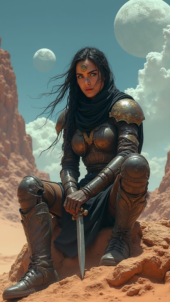 A striking image of a noble warrior woman in a desert landscape, dressed in intricately designed armor and adorned with golden facial decorations, as she sits confidently on a rocky outcropping, ready to face the challenges of a harsh alien world.