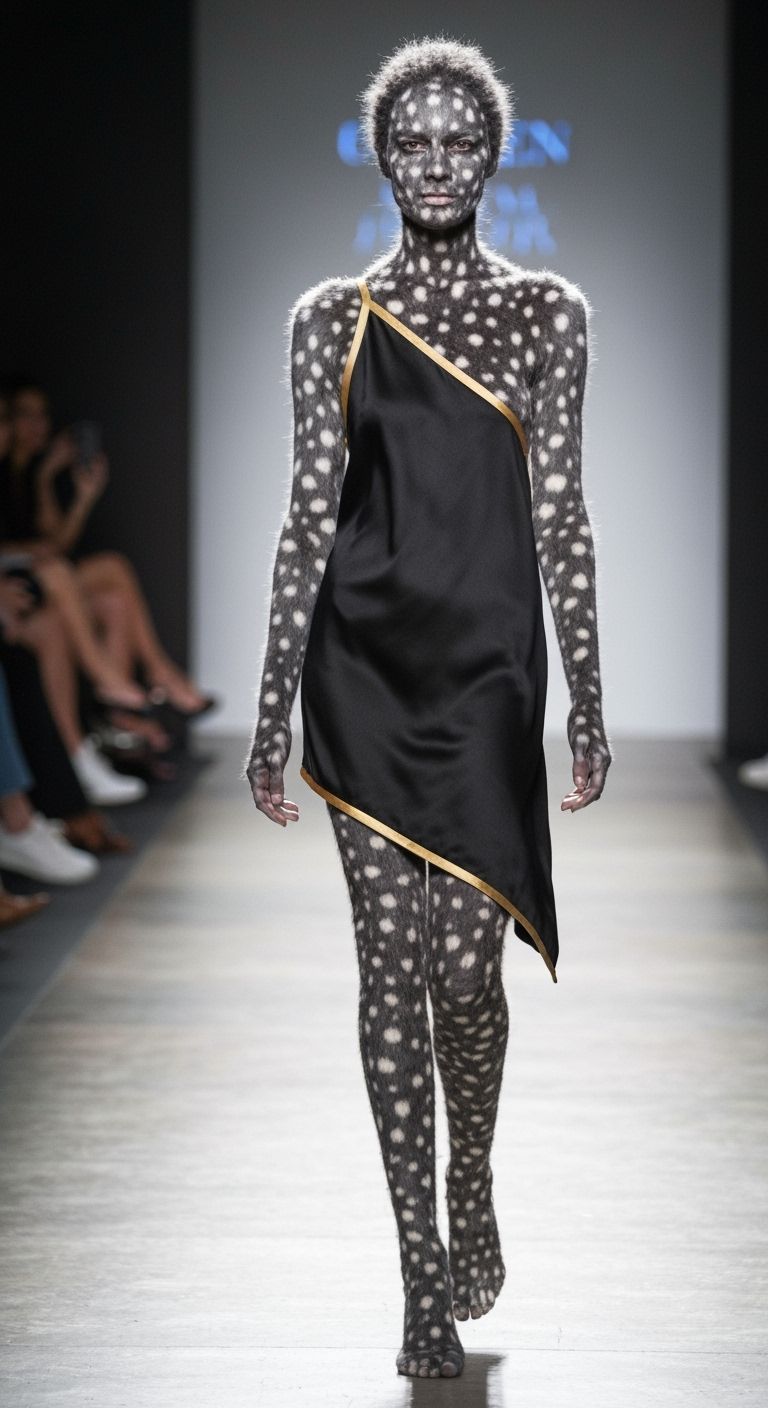 A professional photo showcases a slim model with unique velvety fur skin and pale white spots, wearing a black asymmetrical silk dress with gold trim on a catwalk.