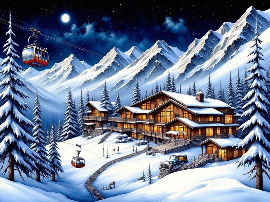 This image depicts a luxurious ski lodge in the snow-covered Alps, accessible by a sleek cable car, against a dark starry night sky, rendered in a detailed, intricately drawn art deco style with bold lines and geometric patterns.