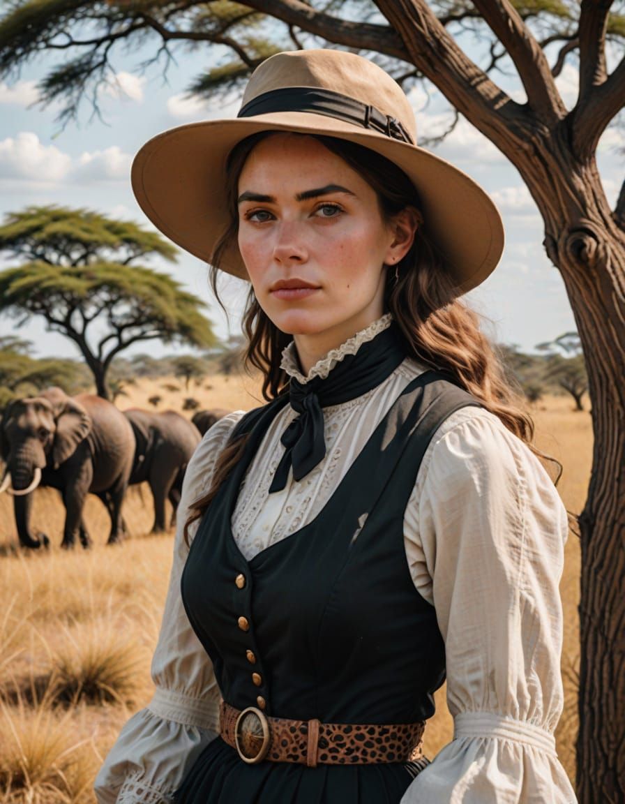 This image captures a refined young woman dressed in Victorian attire, immersed in the untamed wilderness of Africa, surrounded by exotic wildlife and majestic landscapes.