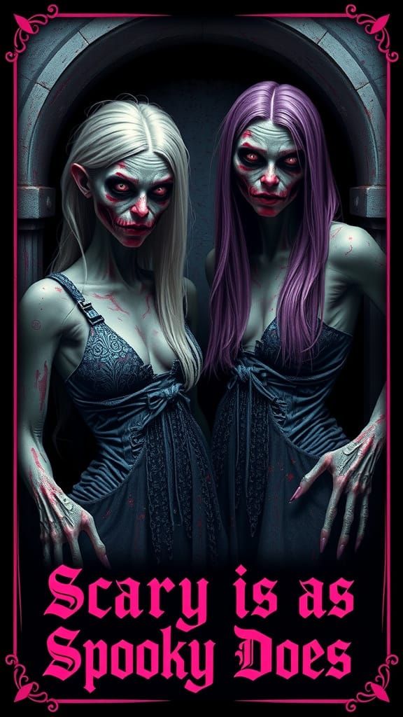 This image features two frightening zombie creatures with unique hair colors in a crypt. Text at the bottom reads "Scary is as Spooky Does" in a distressed, carved stone gothic font.