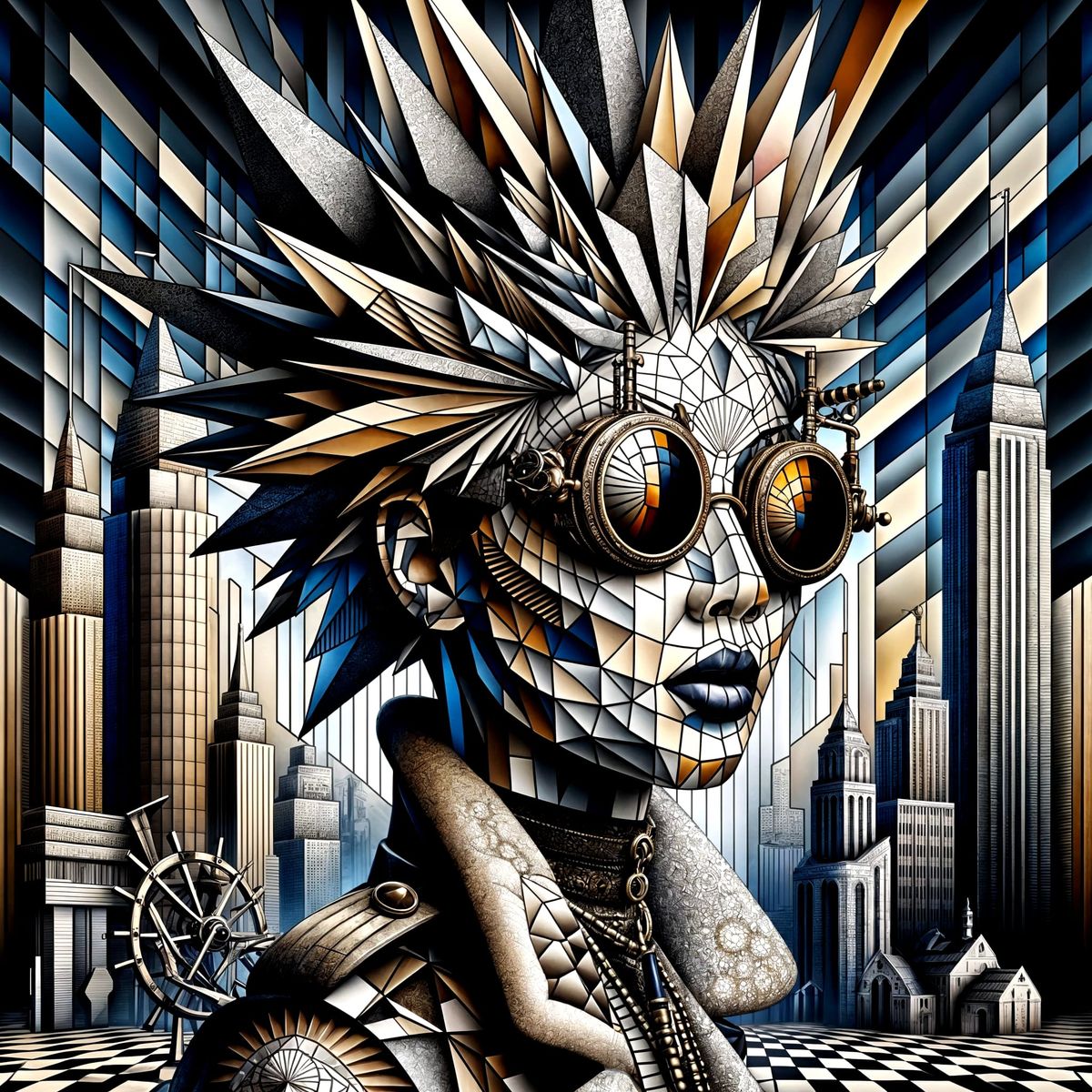 This image features a hyper-realistic 3D illustration of a Steampunk woman with geometric patterns. The scene depicts a detailed cityscape in a Cubist style with a dark white and bronze palette.
