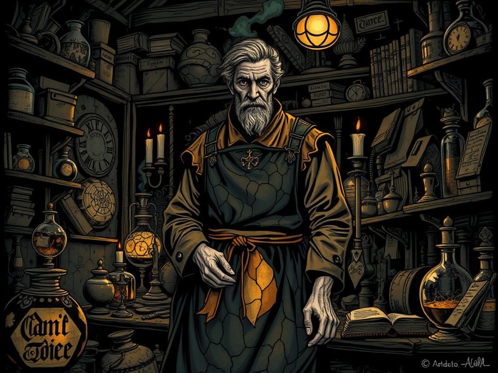 This image shows a medieval alchemist in a cluttered laboratory, wearing a unique stained glass apron. The scene features bubbling alembics and ancient tomes illuminated by candlelight, rendered in a dark fantasy serigraphy style.