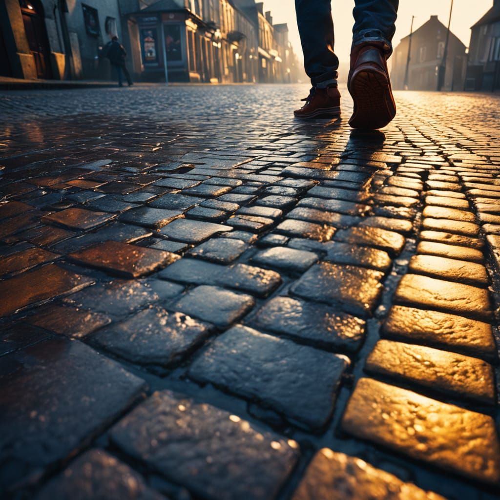 This image shows a person in Pornic during the golden hour. Wet cobblestones reflect the light in this hyperrealistic, cinematic shot with vivid colors and a misty, atmospheric mood.