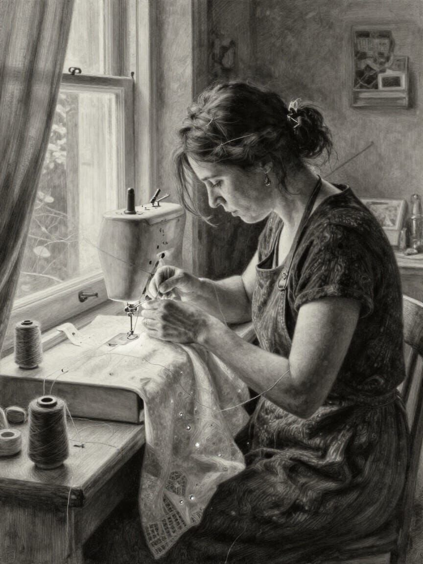 This work feels calm and devoted. The quiet focus of the woman at her sewing machine turns routine labor into something tender and meaningful. Light from the window softens the scene, highlighting patience, care, and dignity in everyday creation.