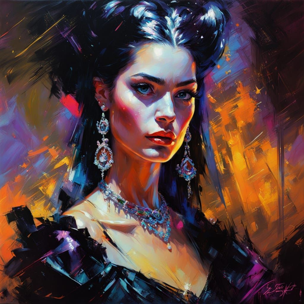 This image is a close-up portrait of a Disney princess in a tense, high-contrast ballroom setting, illuminated by blacklight neon lights, capturing a moment of fierce intensity.