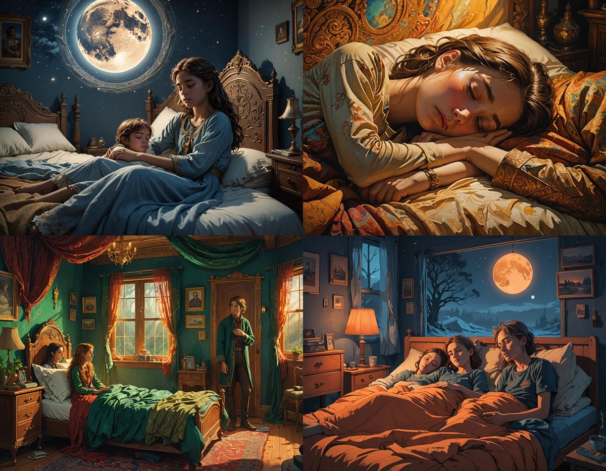 This image shows a young girl asleep on her brother's bed as he answers her questions. The scene is rendered as detailed matte painting with complementary colors and intricate details.