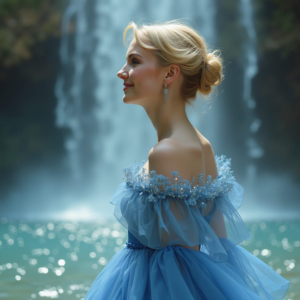 A hyperrealistic image of a smiling, elegant European woman with blonde hair in a chignon, wearing a light blue dress. She gazes at a sparkling waterfall with soft lighting and precise detail.