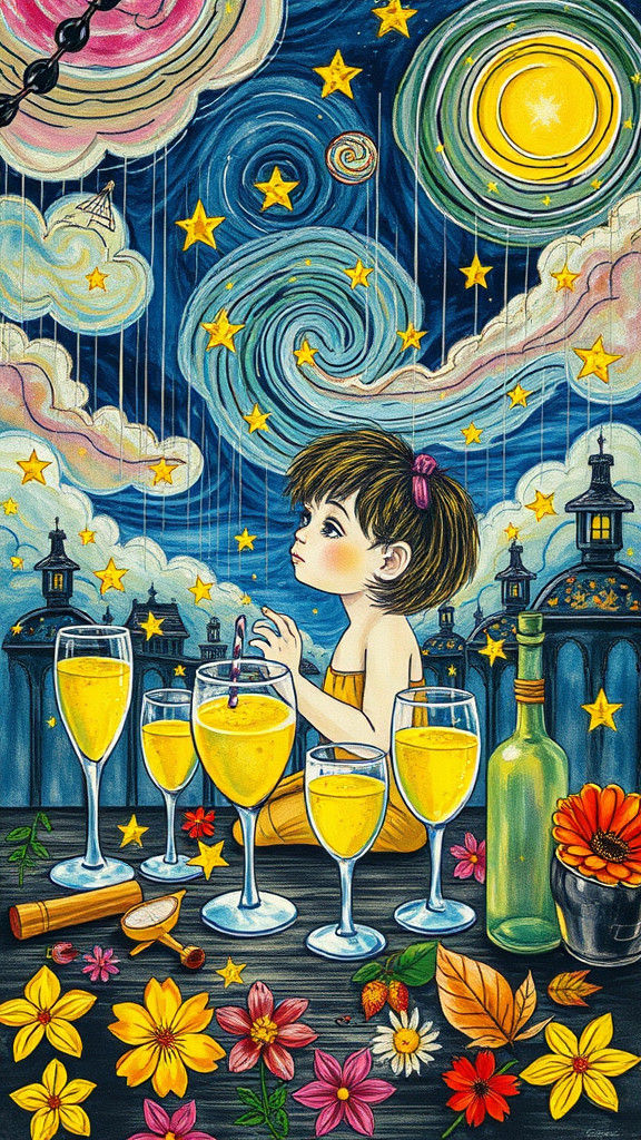 A dreamy image of a child gazing at stars in a crayon-drawn city, with glasses of golden stars under a rainy sky. The image is a whimsical blend of surrealism and naive art.