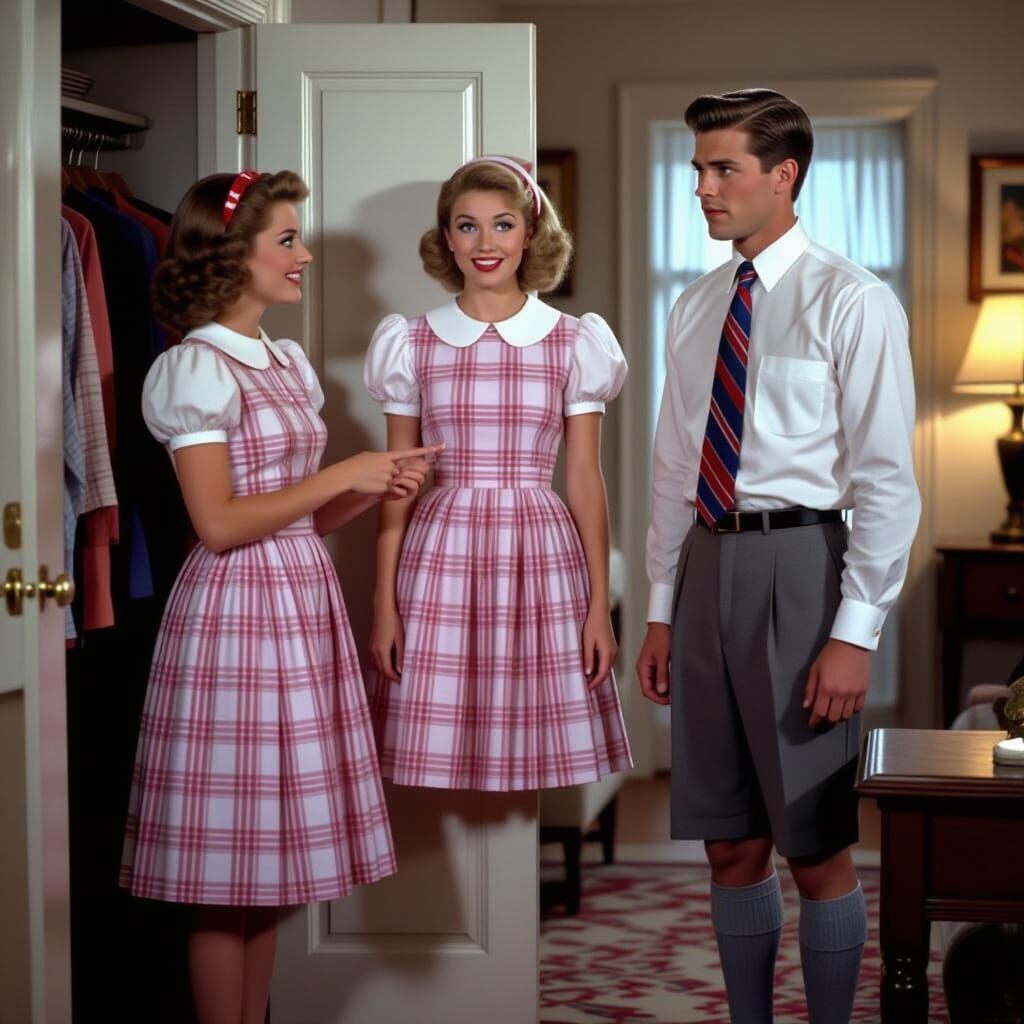 This image shows a smiling woman in a cozy living room pointing to a pink dress. A worried young man stands nearby, in a cinematic film still with nostalgic film grain.