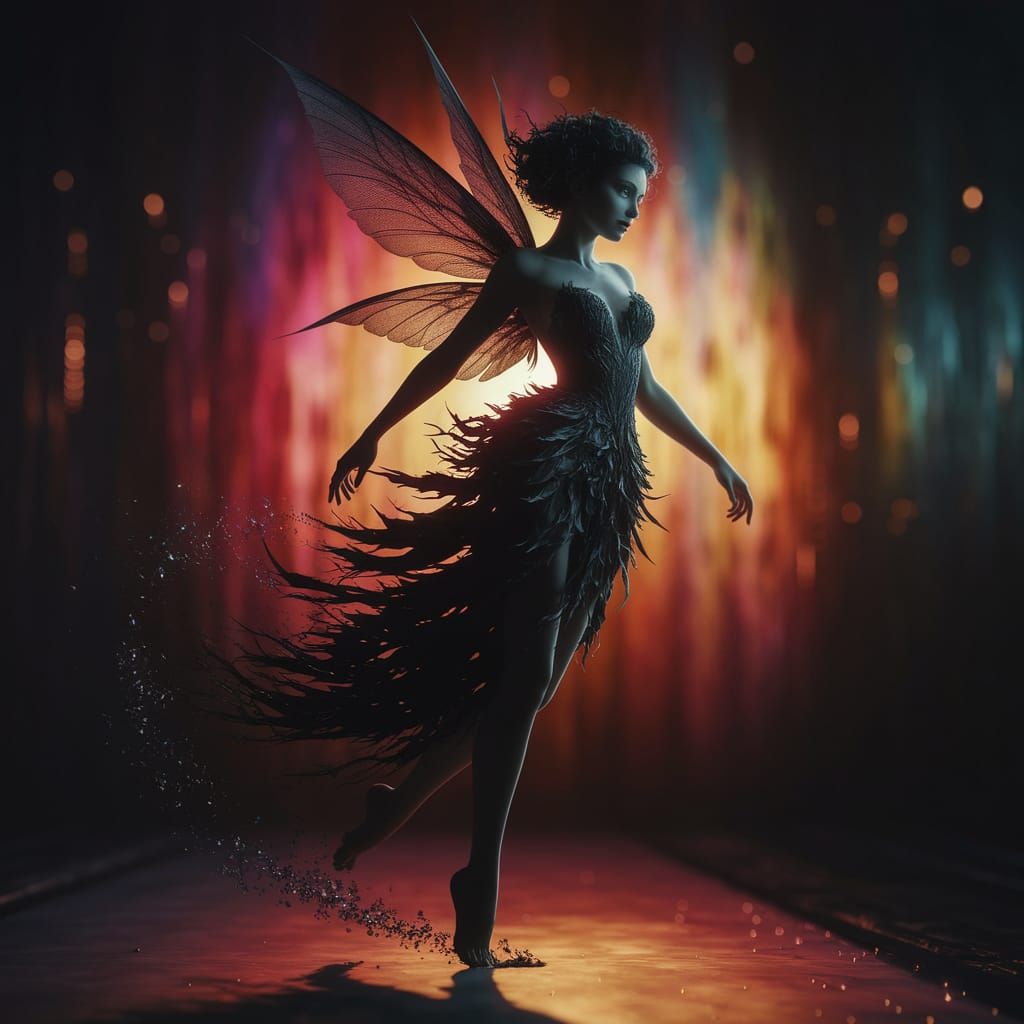 A digital art piece showing a wingless 'Shadow-Walker Fairy' gliding through shadows. Her silhouette shifts with the light, leaving trails of ephemeral whispers. The noir-inspired art features a vibrant, warm-toned background.