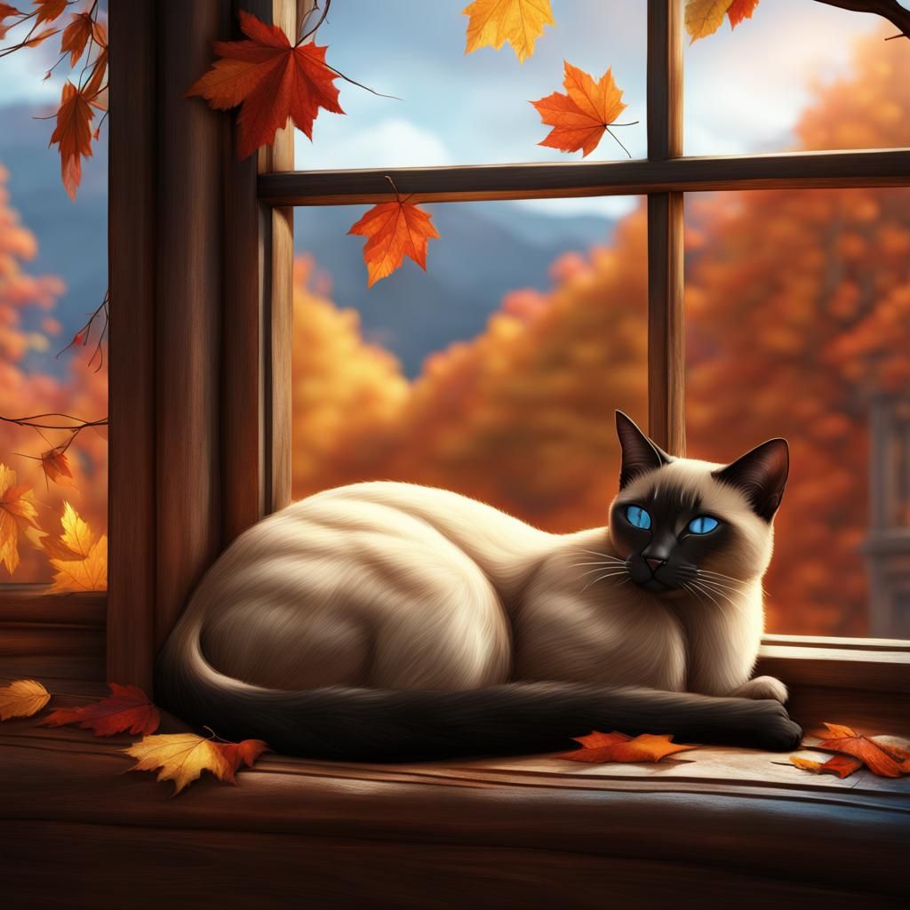 A detailed matte painting of a Siamese cat sleeping by a window on an autumn day. Fantasy concept art with deep color and intricate details in complementary colors.
