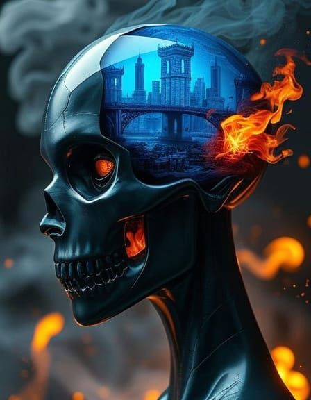 A surreal sculpture of a monster's head crafted from black obsidian, featuring gold seams. A sapphire city glows within the skull, with an eye of fire shedding a tear, all in a wicked, smoky atmosphere.