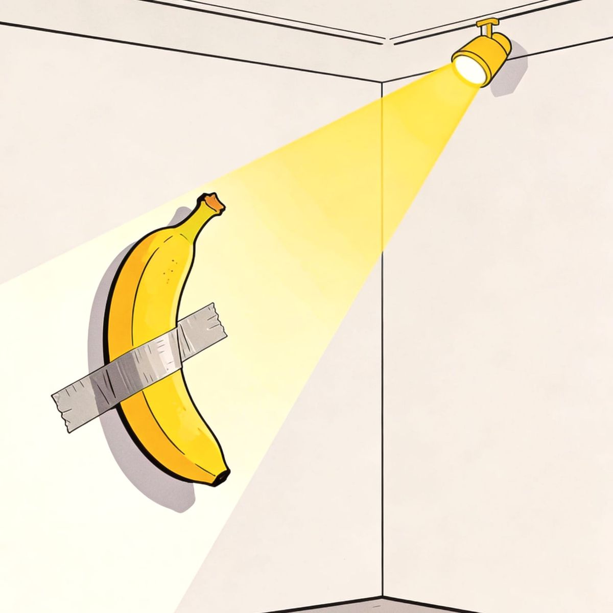 This image shows a minimalist illustration of a vibrant banana, attached to a wall with tape, under a yellow spotlight in an art gallery setting. Rendered with simple, basic lines.
