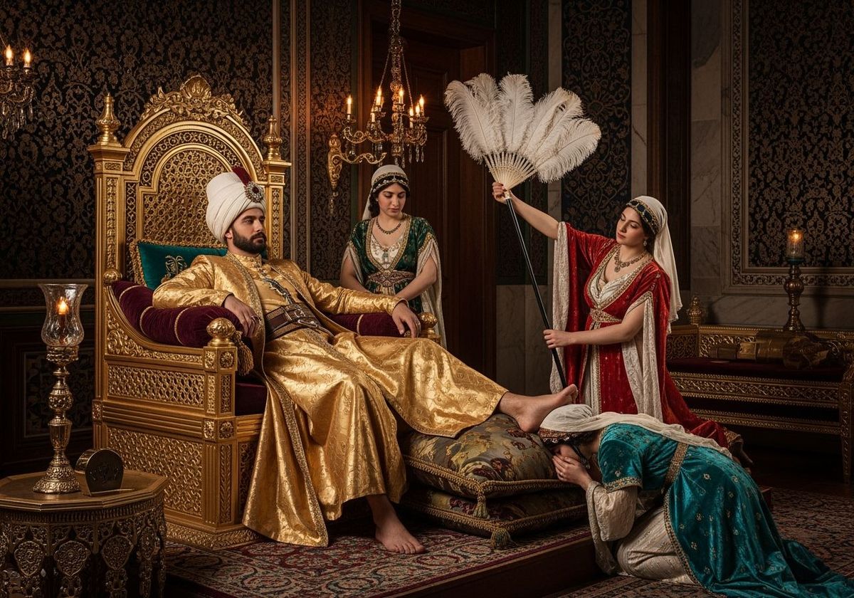 This image shows an Ottoman Sultan relaxing on a jewel-encrusted throne. Concubines attend to him in the opulent throne room of his palace, reminiscent of 19th-century Orientalist paintings.