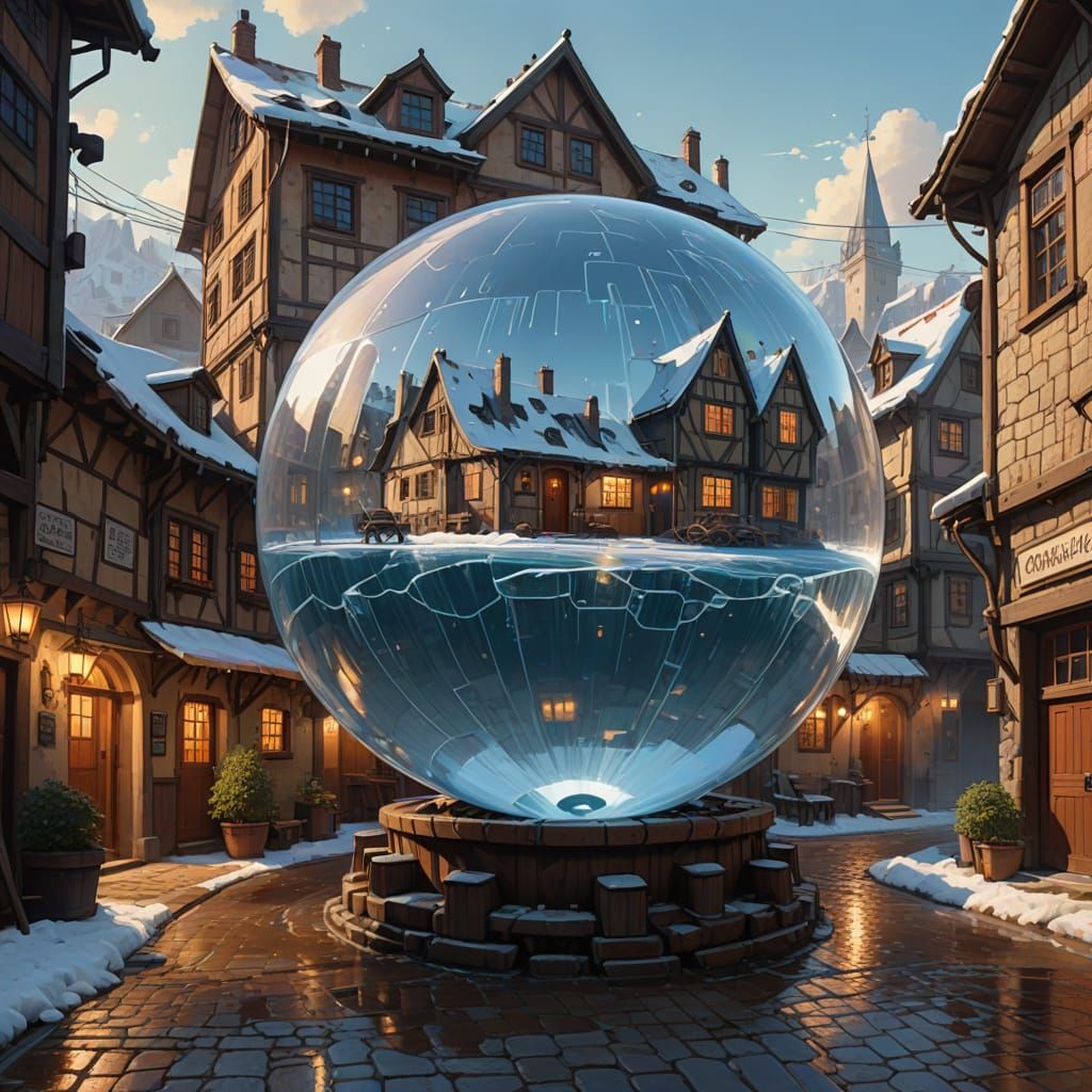 A medium shot digital artwork depicts a massive water sphere over a snowy street lined with taverns, bathed in a warm, golden hour glow. Cinematic atmosphere.