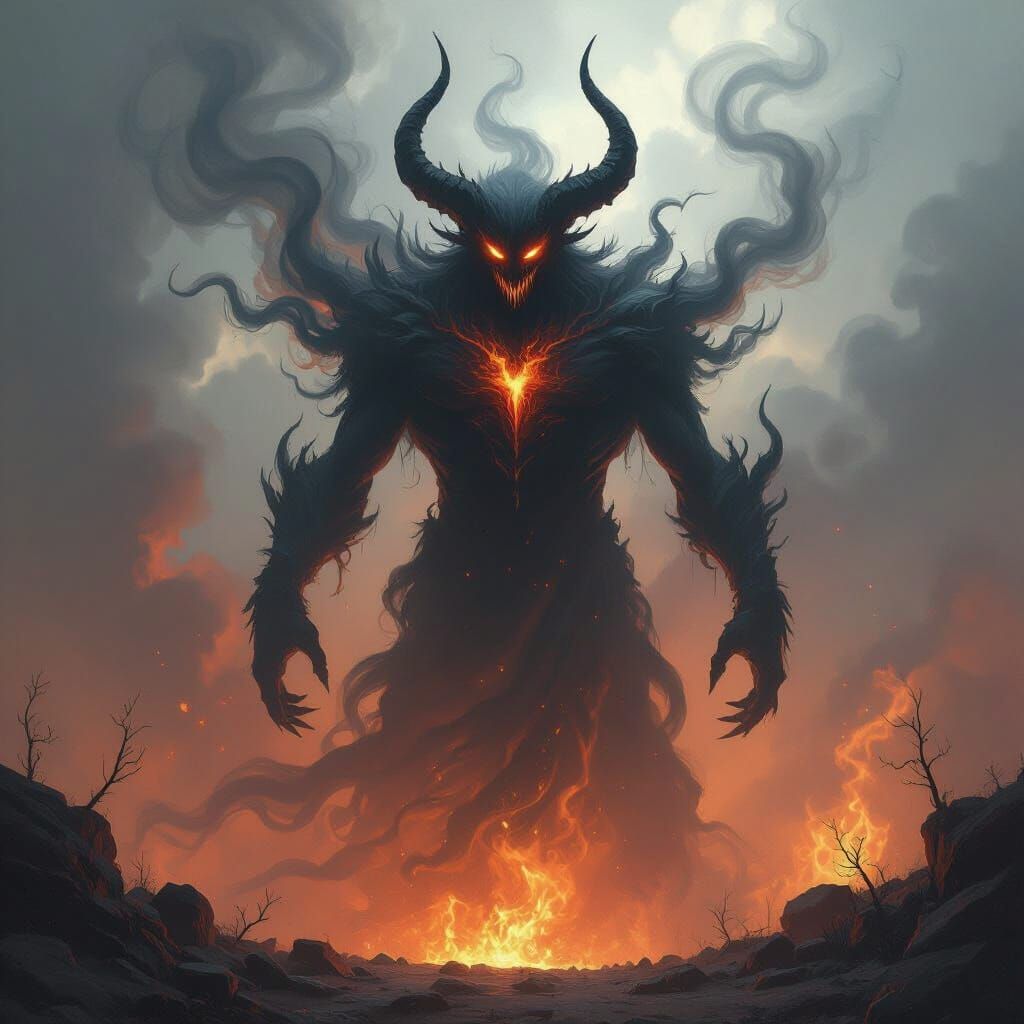 This image depicts a colossal demon composed of swirling smoke, illuminated by glowing embers and dramatic lighting. It features a dark fantasy concept art aesthetic with vibrant, contrasting colors.