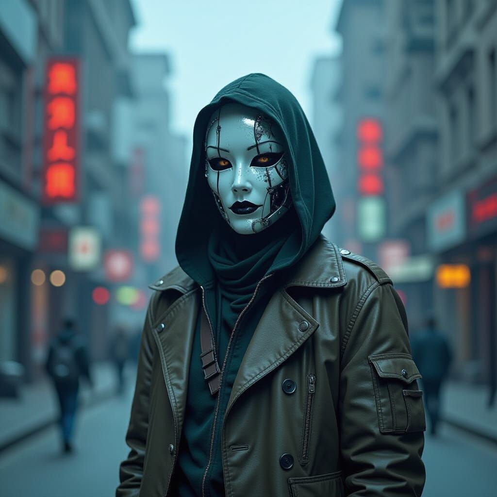 This image shows a solitary figure with chrome implants and a fractured mask moving through a shifting dystopian cityscape. The artwork blends neon-lit futurism with biomechanical and industrial horror elements.