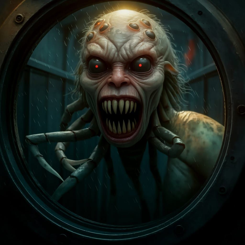 A terrifying flea-monster and mermaid hybrid walks a dark hallway. The creature features tentacles, a pincer mouth, spider eyes, and a demonic face, set against a backdrop of soft hail in golden hour lighting. This image is photorealistic.