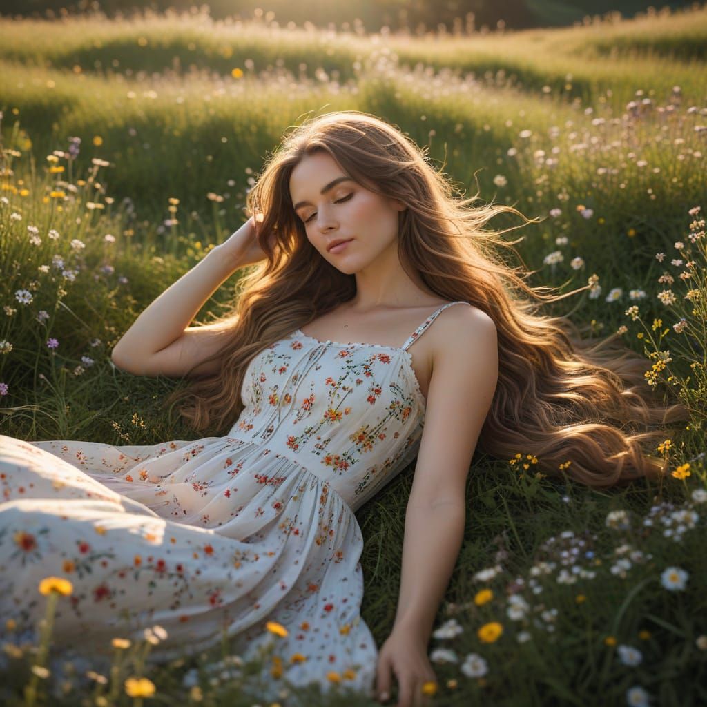A serene picture of a young woman in a meadow, surrounded by vibrant wildflowers, bathed in warm golden hour light, captured with professional photography techniques and crisp focus