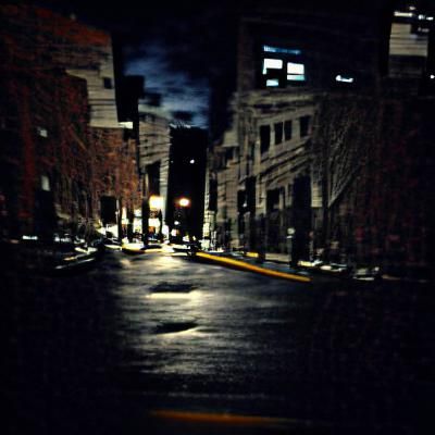 This image depicts a dark city street at night. The scene evokes a sense of mystery and intrigue, capturing an urban environment shrouded in shadows.