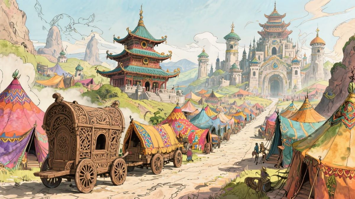 This image shows a vibrant caravan winding through a fantastical landscape of Asian-inspired architecture. The maximalist scene features intricately carved carriages and colorful tents rendered with delicate ink lines and watercolor textures.