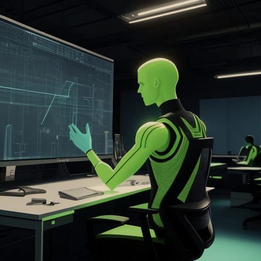 This image showcases young adults engaged in 3D technical drawing within a modern, bright workspace. The scene features a futuristic tech lab with vibrant lighting and a light cyberpunk aesthetic.