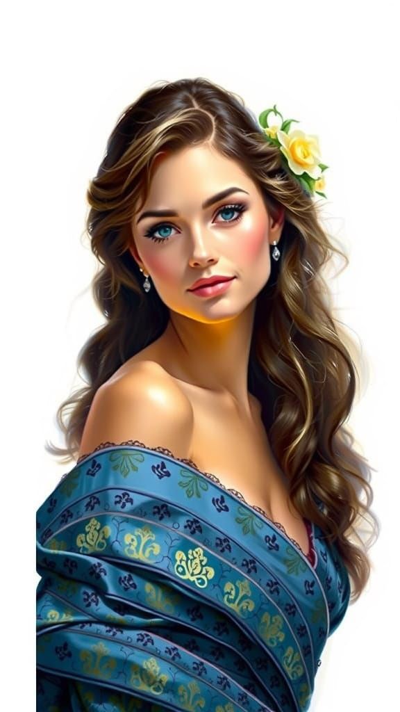 A beautiful woman sits in a lavish, velvet-draped chair, surrounded by lush foliage, wearing a stunning, cobalt blue Renaissance-style gown with intricate gold embroidery, rendered in the warm, rich tones of a classical oil painting.