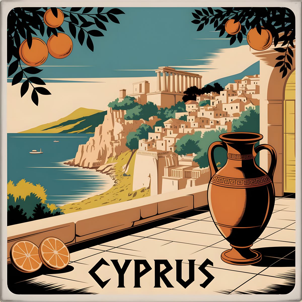 A sunlit vintage-style poster evoking the timeless charm of Cyprus. The sea-facing ruins of Kourion, whitewashed villages nestled in the Troodos hills, and citrus-filled courtyards come together in a Mediterranean tableau. An amphora and orange branch in the foreground honour the island’s mythic and fragrant heritage.