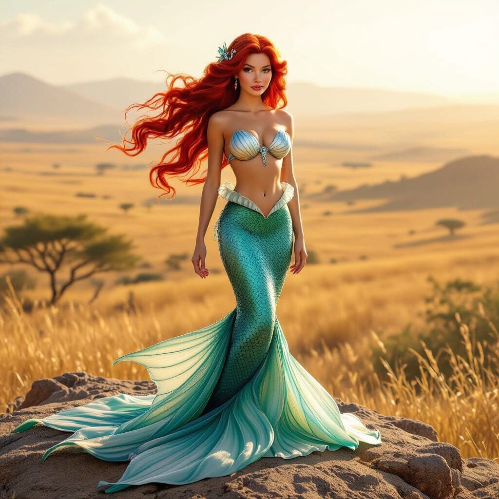 A striking picture of a mermaid princess standing on rocks, overlooking a sunlit savanna. The image is photorealistic, with wildlife photography textures and dramatic lighting, reminiscent of a Disney animation.