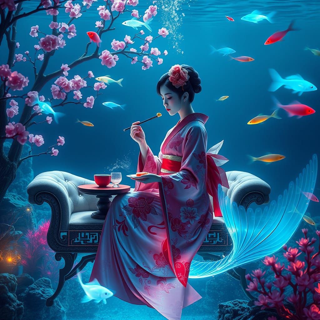 This image shows an underwater fantasy scene of a geisha mermaid performing a tea ceremony while eating sushi. The digital painting features bioluminescent flora and fauna, and Japanese aesthetics.