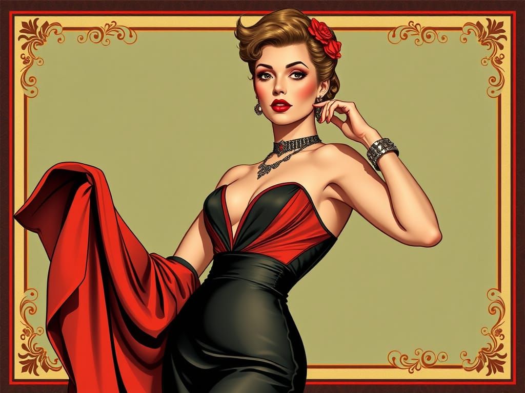 This image shows a confident woman in vintage-inspired clothing striking a classic pose. The artwork features bold lines and meticulous details reminiscent of art nouveau.