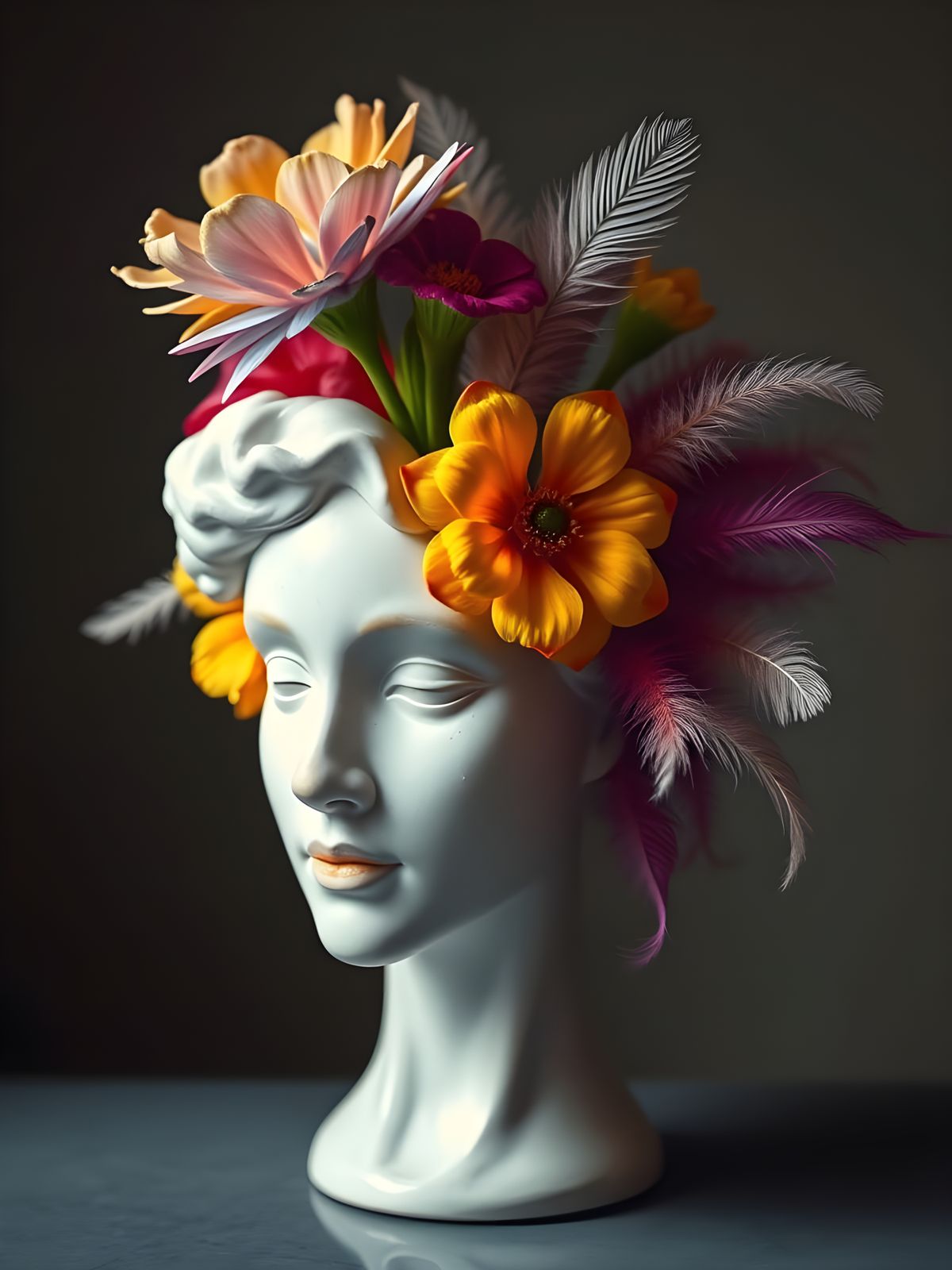 This image features a ceramic head sculpture. Boldly colored plastic flowers and delicate soft feathers emerge from the head, creating a unique and artistic composition.